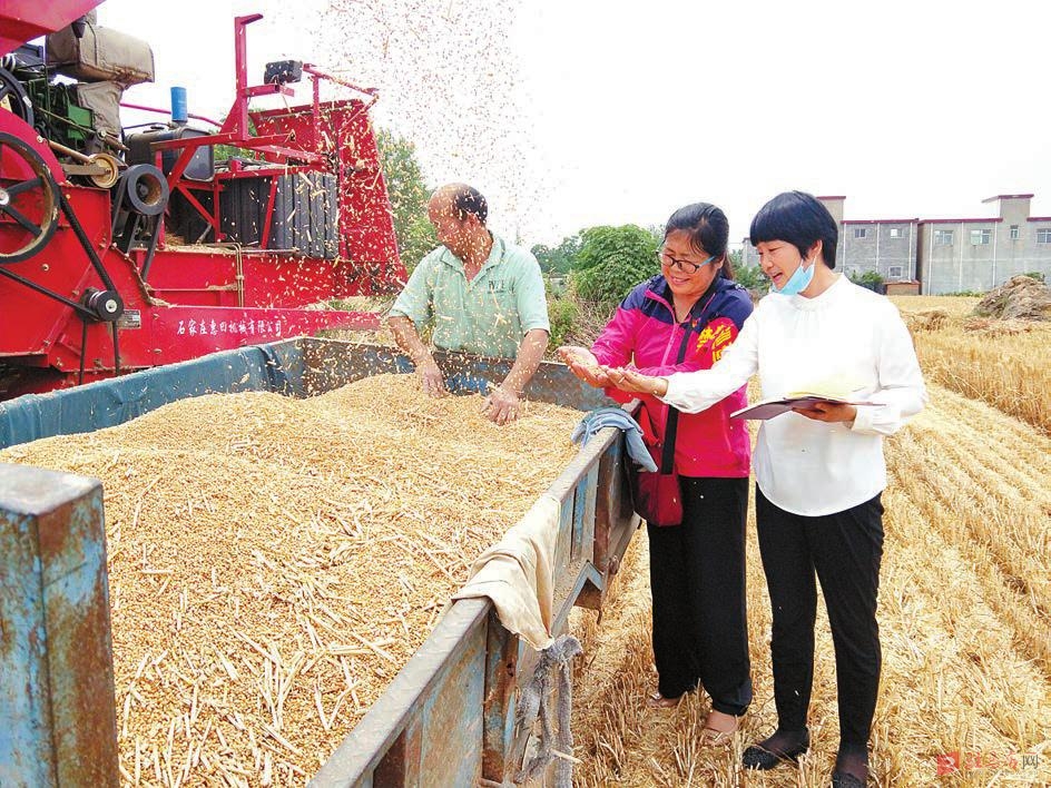 5月25日,新蔡县李桥回族镇狮子口村小麦开镰收割。该村驻村第一书记原玉荣(中)在田间地头向农户宣传三夏生产暨麦田防火注意事项,并了解今年麦收及预产情况。记者 常敏 摄
