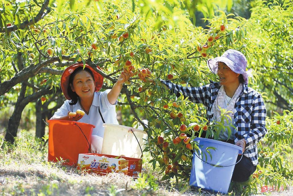 6月4日,市民在驿城区蚁蜂镇聂湾村村民张保红的桃园里采摘蟠桃。