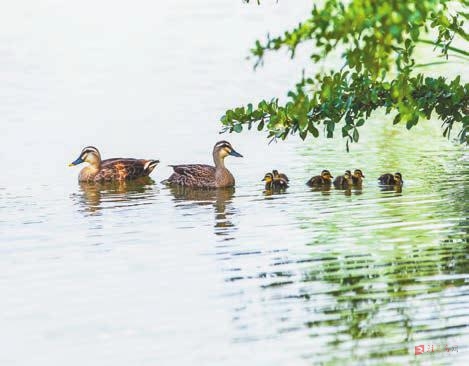 海珠湿地的斑嘴鸭一家(4月29日摄)。