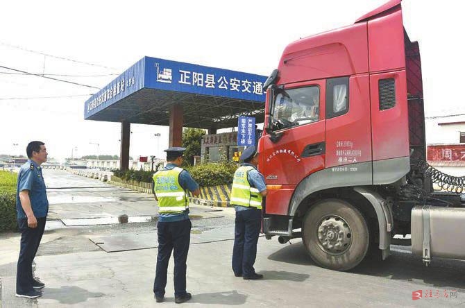 正阳县交通执法人员对过往车辆进行检查。