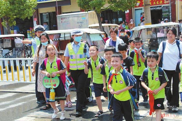 自从市公安局老街派出所民警开展“护学儿童守安全”活动以来,该所民警护送小学生过马路赢得了社会各界的赞誉。图为6月4日,该所民警在护送放学的小学生过马路。