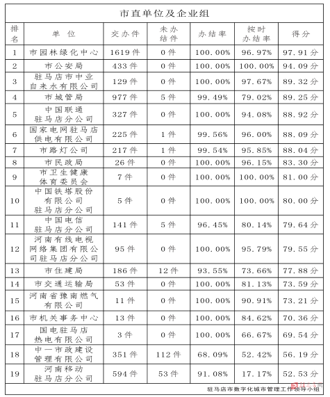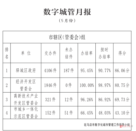 驻马店市中心城区5月份数字化城市管理工作考评排名情况通报