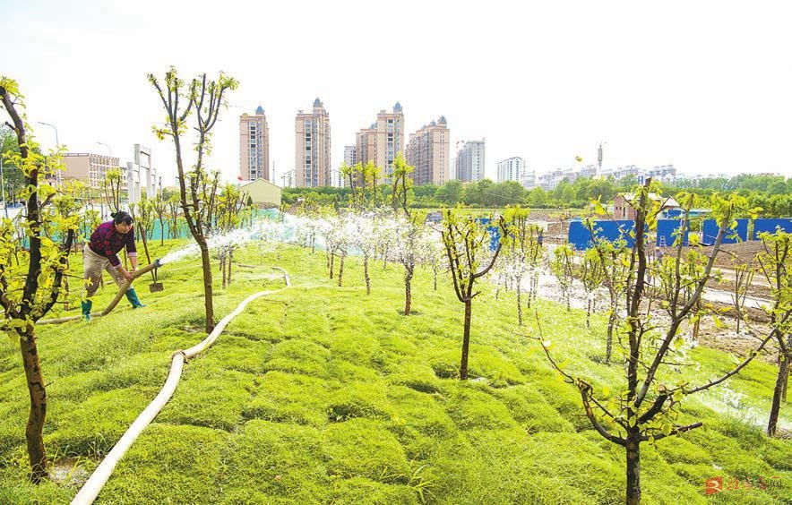 近日,正阳县园林工人正在给正阳公园的草皮浇水。连日来,天气干旱少雨,正阳县园林工人不等不靠,加班加点对绿化苗木进行浇灌,有效减少高温对苗木的损害。