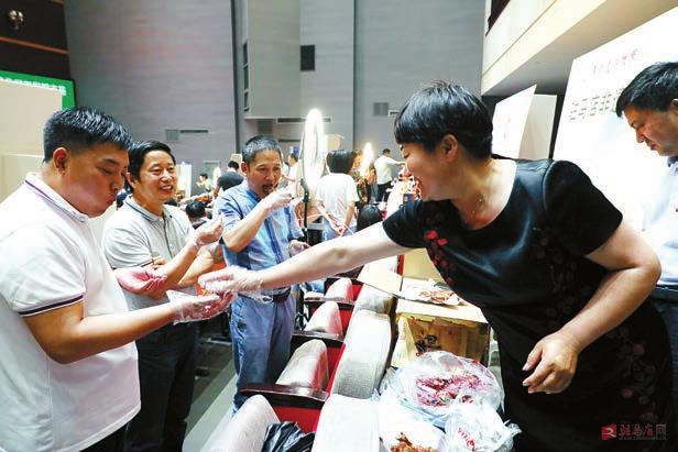 现场品尝确山胳膊牛肉。