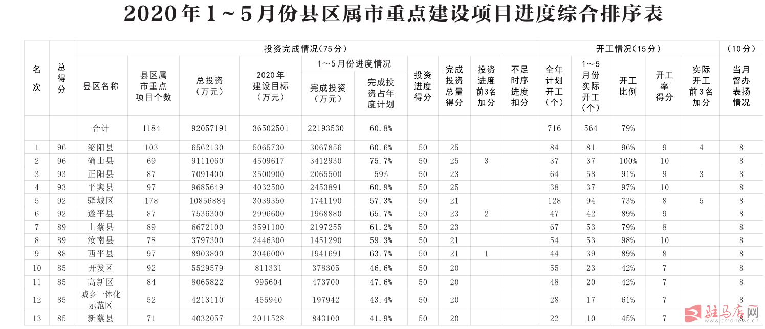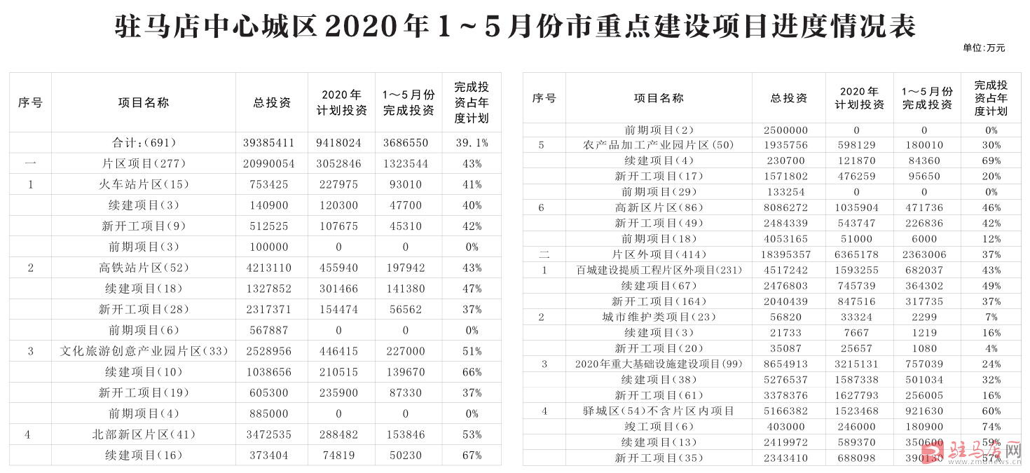 ——驿城区。驿城区项目178个(包含44个片区及134个片区外项目),1~5月份完成投资174亿元,占年度投资计划的57.3%。其中,6个竣工项目累计完成投资18亿元,占年度投资计划的73.5%;37个续建项目累计完成投资67.4亿元,占年度投资计划的60.9%;128个新开工项目累计完成投资88.6亿元,占年度投资计划的52.5%。
