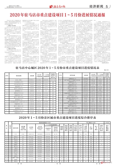 2020年驻马店市重点建设项目1~5月份进展情况通报