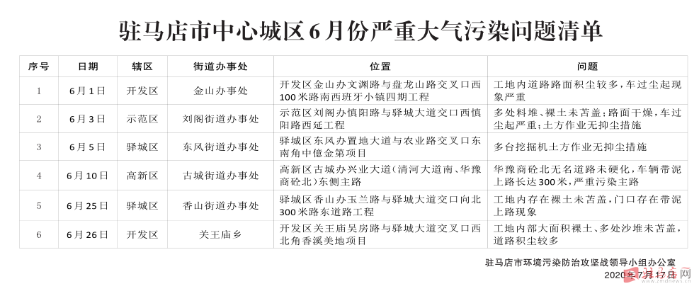 驻马店市中心城区6月份严重大气污染问题清单