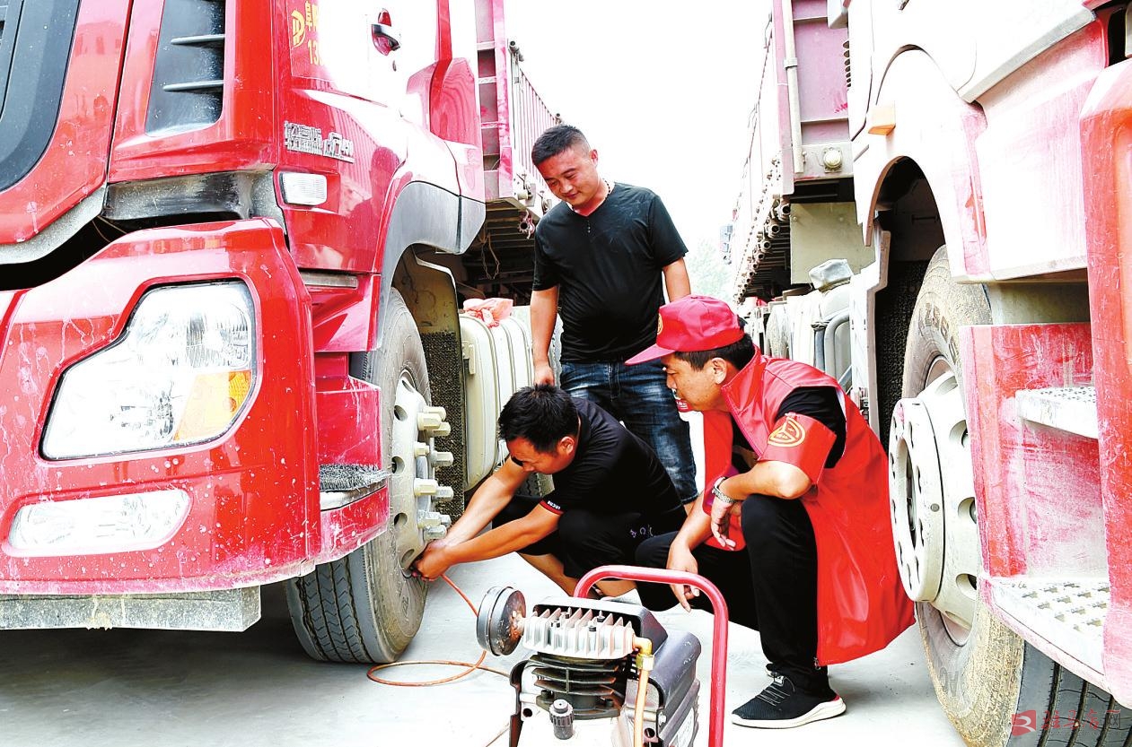 确山县任店道班志愿者为过往车辆提供充气服务。