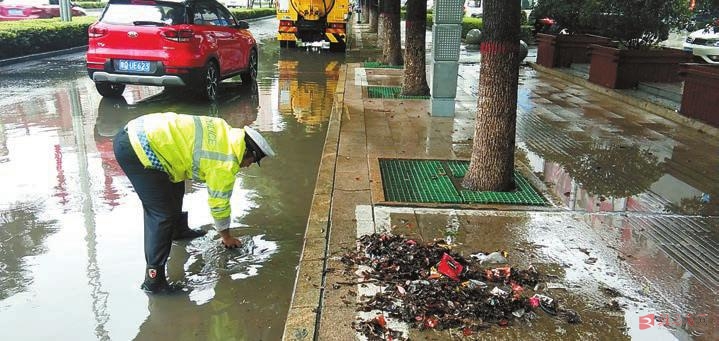 7月22日,由于连降大雨路面积水多,市保安服务有限公司交通辅警一大队的执勤队员及时清理堆积在下水道口的垃圾,确保道路交通畅通。