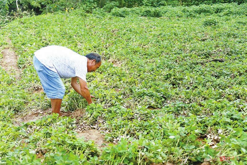 7月23日,驿城区老河乡尚袁庄村民在花生地里整理被雨水冲后露根的花生棵。