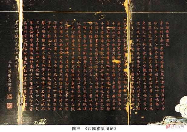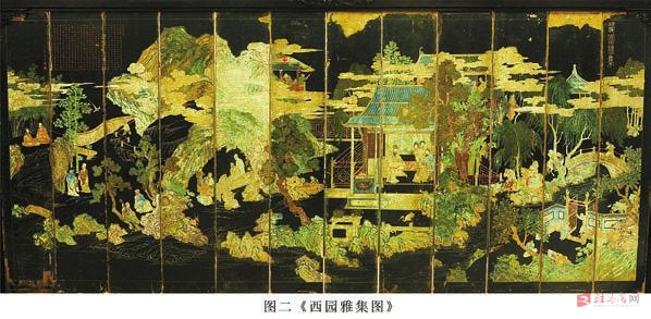 这三组屏风背面,第一组黄景昉撰写荣寿序文屏风的背面是《西园雅集图》(图二《西园雅集图》),第二组洪承畴撰写荣寿序文屏风的《兰亭修禊图》(图五《兰亭修禊图》),第三组《兰亭修禊图》(图六《兰亭修禊图》)屏风的背后没有任何装饰。