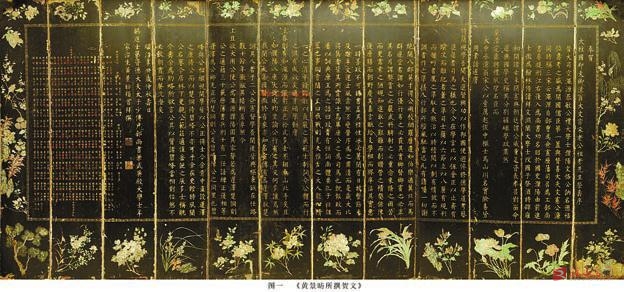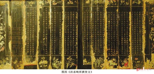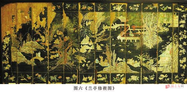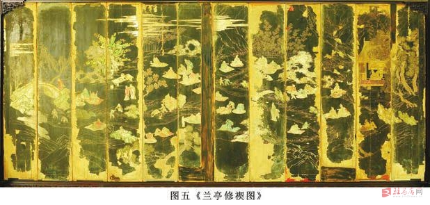 这三组屏风正面中心分别由黄景昉撰写的荣寿序文第一组屏风、洪承畴撰写的荣寿序文第二组屏风及一幅(图六《兰亭修禊图》)屏风组成,中心的四周由回纹饰相隔,回纹饰以外是上下左右烘托中心内容的奇花异草和果类等植物。下边沿由色彩绚丽婀娜多姿的十二花神(兰草、月季、水仙)等进行装饰,以示主人翁的品德高尚;其上边沿用十二种果类(石榴、红枣、葡萄)等累累硕果进行装饰,以示主人翁业绩显赫;左右有其他花卉作为装饰。三组正面屏风的外围以各类相同的花卉、植物等装饰,形成了统一的整体性,为整个屏风增添了神秘的色彩。