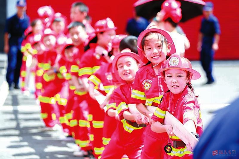 8月6日,学生在毕节市消防救援支队碧阳大道特勤站参加趣味拔河。