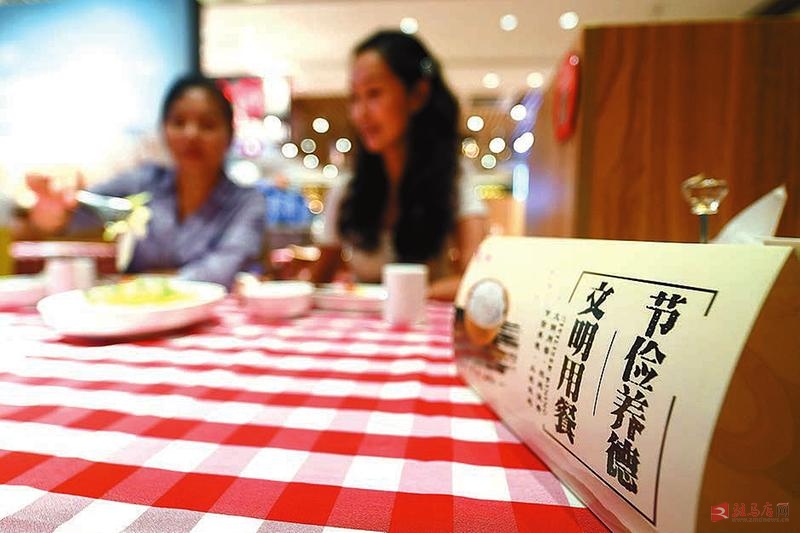 8月17日在石家庄市桥西区一家餐饮企业拍摄的提醒顾客文明用餐的标识。