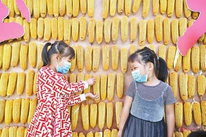 小朋友在第七届中国·公主岭玉米产业博览会上参观展出的玉米。