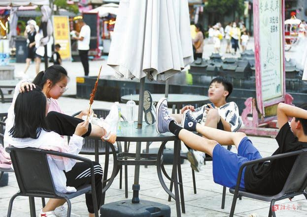 暑期是很多学生游玩放松的高峰期。8月18日,在皇家驿站景区,几位游客把脚放在桌面上。这种不文明行为的出现,折射了部分游客对个人行为缺乏约束。希望我们都能够做文明游客,别让不文明行为“煞”了好风景。记者 李旻 摄