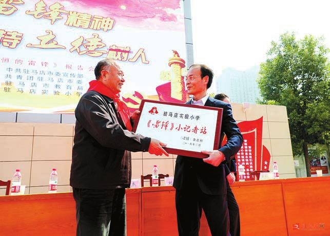 雷锋精神如一粒火种,激励着驻马店实验小学师生,续写着新时代的雷锋之歌。7《雷锋》杂志总编辑陶克将军为驻马店实验小学授牌。(资料图片)