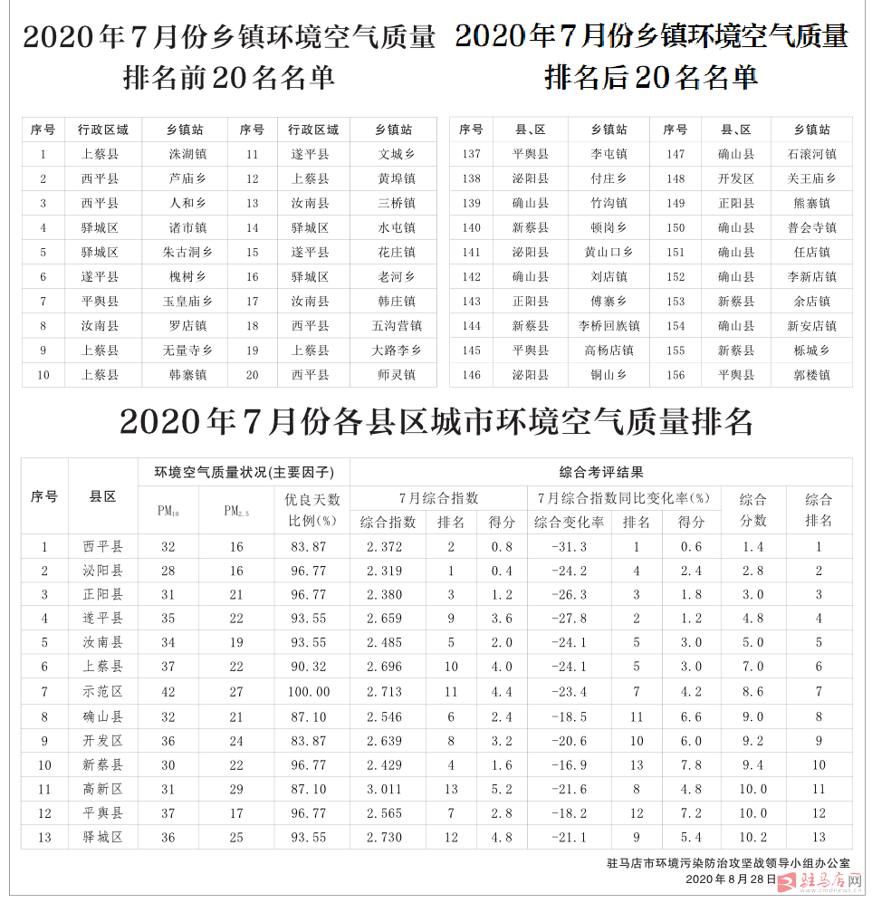 2020年7月份各县区城市环境、乡镇环境空气质量排名