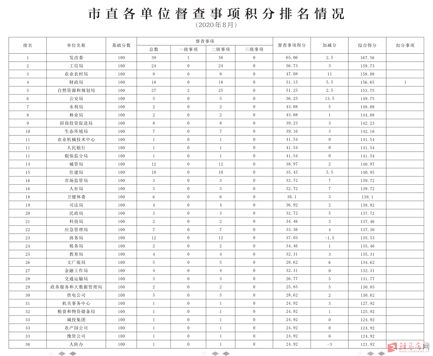 2020年8月份,参与积分排名的事项共计168项,涉及县区13个、市直单位36个。其中市政府重要批示件督办事项84项,市政府安排重要事项84项;加分扣分事项100项(包括项目建设、空气质量、水污染防治、食品安全、智慧城市建设、行政审批窗口服务、数字化城市管理、科技工作、政务信息等9项重点工作,督查工作通报28期)。排名结果如下: