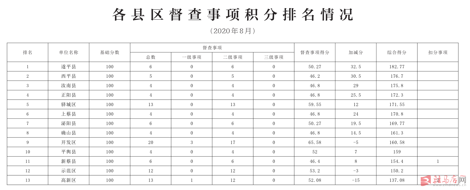 为贯彻落实市政府提出的“干成事是硬道理”的工作准则和“行动迅速、善抓落实、勇争一流、廉政为民”的行为准则,按照《驻马店市人民政府办公室关于进一步加强督查工作推动政府工作高效落实的通知》(驻政办〔2018〕1号)和《驻马店市人民政府办公室关于完善督查事项积分管理工作制度的通知》(驻政办〔2019〕8号)文件要求,市政府对督查事项实行积分管理,坚持一月一汇总,一月一排名,一月一公布。