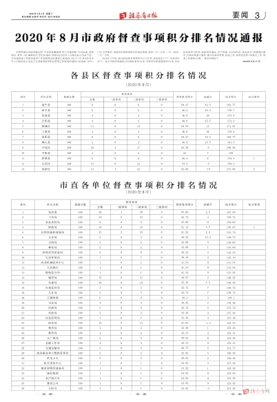 2020年8月市政府督查事项积分排名情况通报