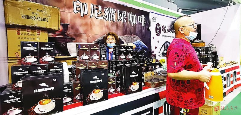 伴着浓浓的咖啡香味,英国罗伊福勒食品公司推出的咖啡免费品尝,吸引了很多参观者驻足。一名热情的工作人员在记者采访本上写下他的中文名字:张三一。他用不太流利的中文介绍,他们的咖啡味道很好,价格也不贵,他们公司刚刚进入中国市场,希望能得到中国消费者的喜欢。不远处一家泰国公司展的芒果和芒果制品也很受欢迎,硕大的青芒10元一斤,仍然有人排队购买。
