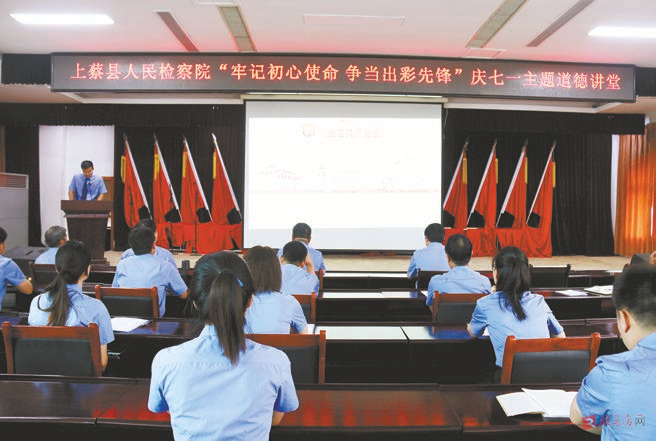 笃行·文明道德大讲堂——以道德讲堂为依托,全力打造上检精神家园。该院采取政治部主导,各党支部协同参与的活动模式,每季度由2个党支部共同主办道德讲堂,充分发挥党支部党员的主动性、创造性,弘扬检察文化。因地制宜搞好阵地建设,在楼道、电梯、食堂、草坪等适宜位置设置党建宣传画、张贴提示语、布置文化长廊。利用“上蔡检察”微信公众号等新媒体,及时宣传党建工作动态,营造浓厚氛围。深入开展“不忘初心、牢记使命”主题教育、节日主题演讲、党史和法治知识竞赛等丰富多彩的党建活动,凝聚强大党建合力。充分发挥典型示范引导带动作用,唱响检察主旋律,弘扬检察正能量,涌现了全市扫黑除恶先进个人张涛、退休不退责老党员张平福、疫情一线紧急救助孕妇的邝鹏飞等一批先进典型。