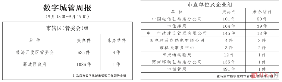 驻马店市数字化城市管理案件办理后进单位周通报