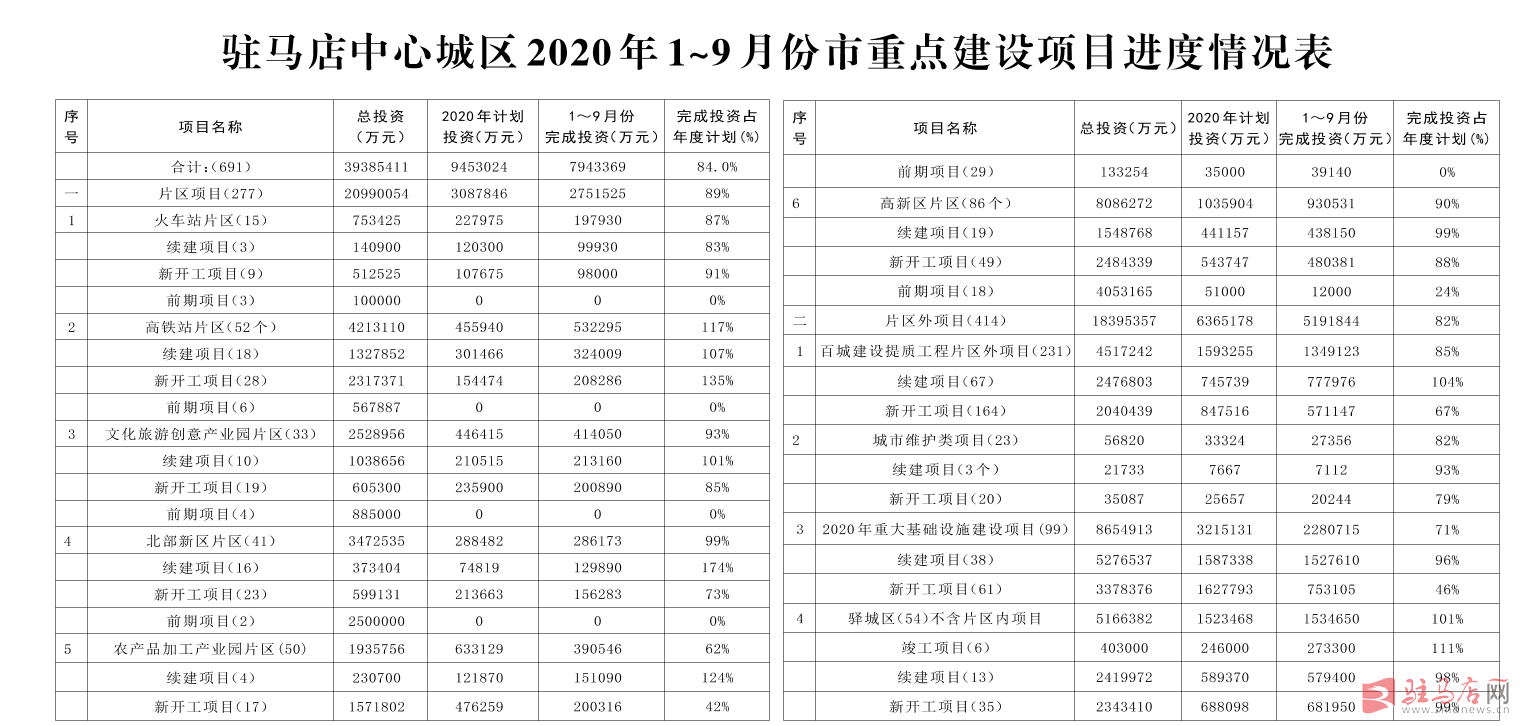 2020年驻马店市重点建设项目1~9月份进展情况