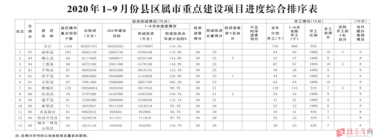 汝南县。汝南县项目78个,1~9月份完成投资339.3亿元,占年度投资计划的139%。其中,13个竣工项目累计完成投资88.9亿元,占年度投资计划的151;11个续建项目累计完成投资68.3亿元,占年度投资计划的138%;54个新开工项目累计完成投资182亿元,占年度投资计划的134%。
