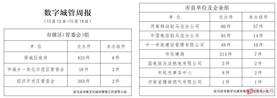 驻马店市数字化城市管理案件办理后进单位周通报