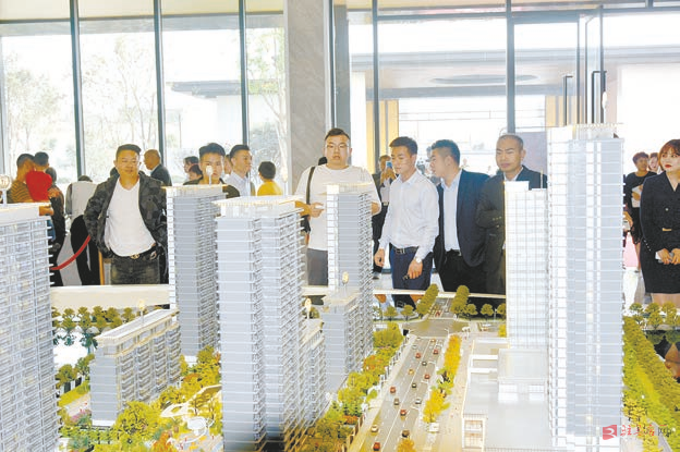 锦秀·贵源售楼部,人们在仔细品鉴项目玻璃立面与转角玻璃阳台。王玉民 摄