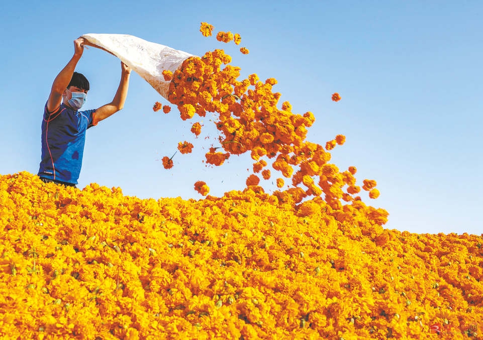 新疆于田县的村民将称重后的万寿菊倒入发酵池(9月20日摄)。