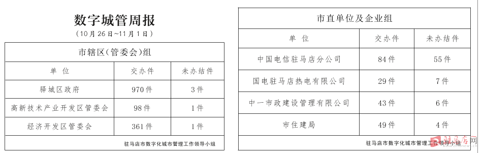 10月26日~11月1日,驻马店市智慧城市管理中心通过采集员、网格员采集上报、视频抓拍、市民举报、领导交办等途径受理各类城市管理案件4070件,本周应结案3958件,其中已结案3629件、正在办理中104件、超时未办结77件、因确权争议未处置案件共148件,结案率91.69%,所有案件均通过数字城管系统派遣交办至19个联动单位。经采集员核查,截至11月1日18时,存在超时未办结案件的单位共7个,详细情况如下: