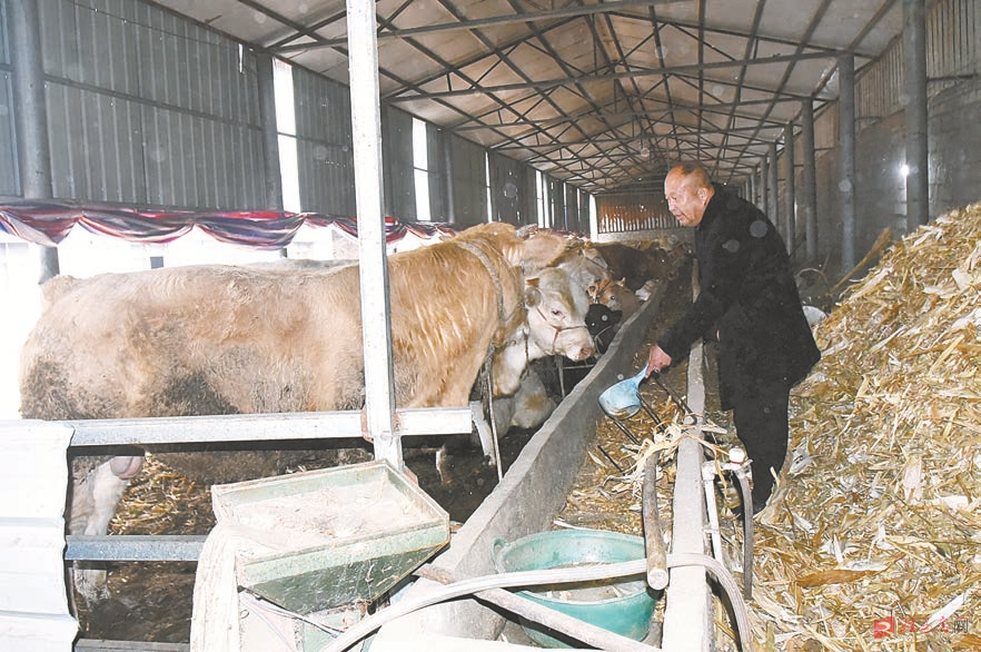 1998年11月,郑治成从部队转业回到家乡泌阳县下碑寺乡创业。2013年,郑治成建起了牛舍,成立了泌阳县下碑寺宏业养殖专业合作社,引进了10头母牛,收入也越来越高。2017年4月,48岁的郑治成因脑梗死落下了半身不遂的后遗症,但出院后他迈着蹒跚的步伐,依然每天出现在养殖合作社,发展养殖业的热情丝毫不减。目前,郑治成的宏业养殖专业合作社除了为贫困户提供工作岗位,还大量收购秸秆草料,仅此一项就为周边群众每年增加收入20万元以上。图为郑治成在养殖场喂牛。