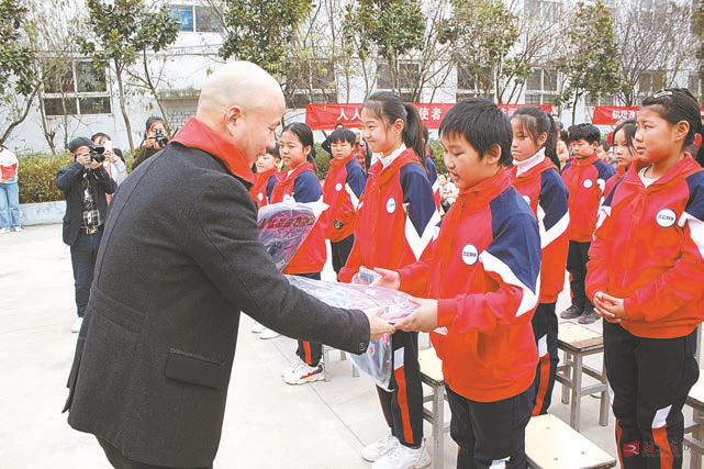 爱心人士为学生发放学习用品。