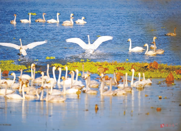 据我市相关部门介绍,今年白天鹅回来的时间更早,比去年提前一个月,或许是宿鸭湖清淤扩容、生态环境进一步改善的原因。早期回来的天鹅有500多只,还有各种珍稀鸟类,如灰鹤、鸿雁等。