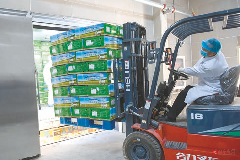 图② 工作人员操作叉车准备将包装好的羊肉放入集装箱冷链车。