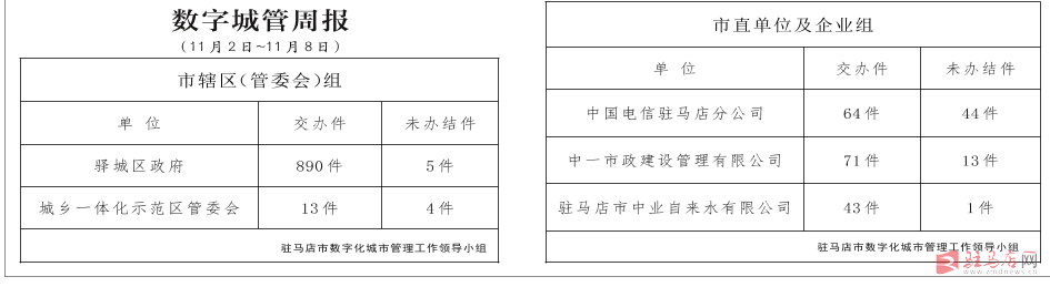 2020年11月2日~2020年11月8日,驻马店市智慧城市管理中心通过采集员、网格员采集上报、视频抓拍、市民举报、领导交办等途径受理各类城市管理案件4705件,本周应结案4472件,其中已结案4015件、正在办理中194件、超时未办结67件、因确权争议未处置案件共196件,结案率89.78%,所有案件均通过数字城管系统派遣交办至19个联动单位,经采集员核查,截至11月8日18时,存在超时未办结案件的单位共5个,详细情况如下: