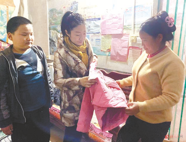 近日,河南省青联常委刘岩趁寒冬到来之前,为新蔡县涧头乡毛岗村捐赠233件羽绒服。图为河南省青联委员、新蔡县融媒体中心驻涧头乡毛岗村驻村第一书记李玲娜将爱心羽绒服送到贫困户陈彩云家中。