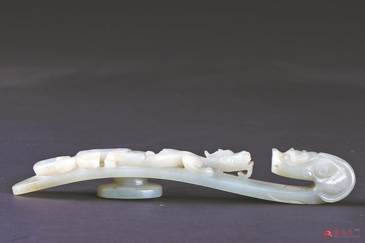 玉质青白色。钩首为龙首,钩背上浮雕一螭龙,寓意“苍龙教子”。龙首双角后抿,滴水眼,口微张,嘴拱平齐。螭龙曲身向前,螭头略呈三角形,高额、猫耳、长发、三足爪,卷尾分叉,背上刻脊线。钩身下部有一椭圆形钩钮,钮柱较矮。