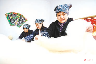 11月22日,在山东省淄博市沂源县东里镇一家布衣坊,几名农家女在整理做小棉袄用的棉花。