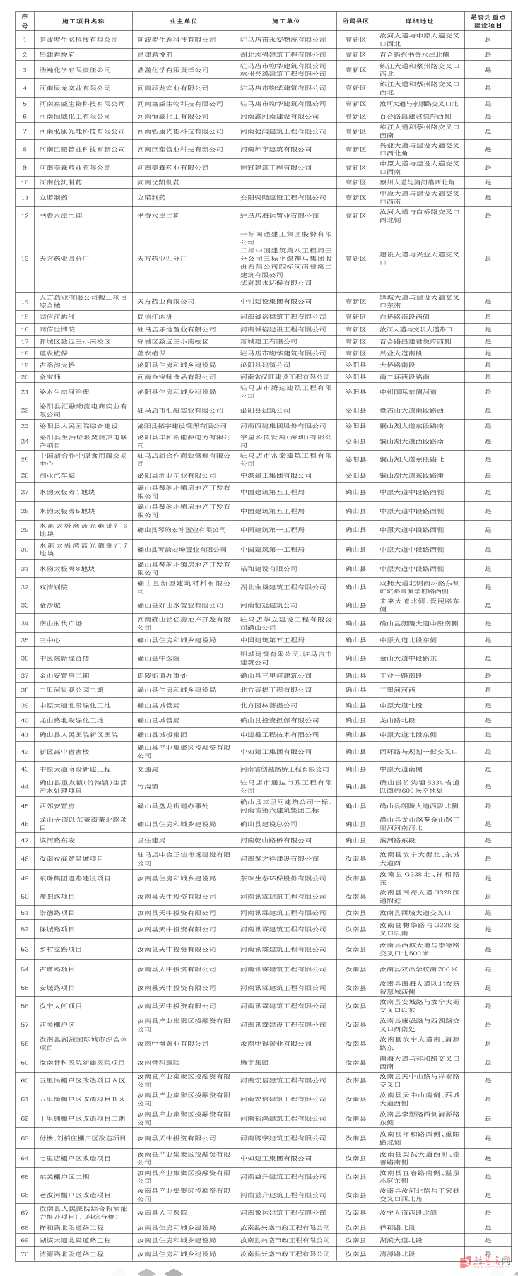 各县区环境污染防治攻坚办及市直相关部门上报需在重污染天气管控期间施工的重点项目、民生工程等重大施工项目,已按照省环境污染防治攻坚办关于重点工程施工项目在重污染天气管控期间免于管控的审批要求,经市政府批准,现将驻马店市重点施工项目清单进行公示,接受公众监督。