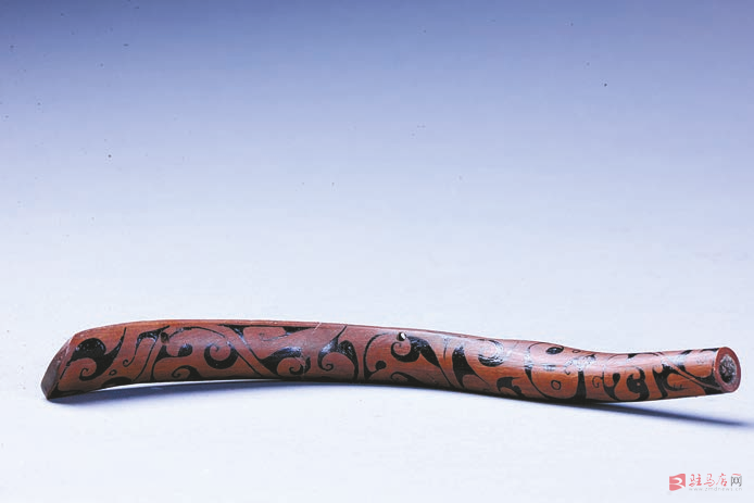 新蔡葛陵楚墓出土,整器由上、中、下三部分组成,上部为截去尖端的圆锥形管状柄把,其截面为环形,中间镂空;中部为一圆珠状凸箍,箍中穿有一根圆形骨柱将上下两部分连在一起;下部个体较大,呈扁舌形,侧视呈弧状弯曲。器体中间和下部钻出左右两个横列的小圆形穿孔。器身花纹用黑漆描绘,圆锥形柄把分饰上下,两组相向的三角纹,由较细的墨线绘成,每个三角形内又都施以细线卷云纹。凸箍饰“S”形卷云纹,身部花纹以云纹为主,杂以弧线勾连纹,体现出绚丽多姿的装饰效果。