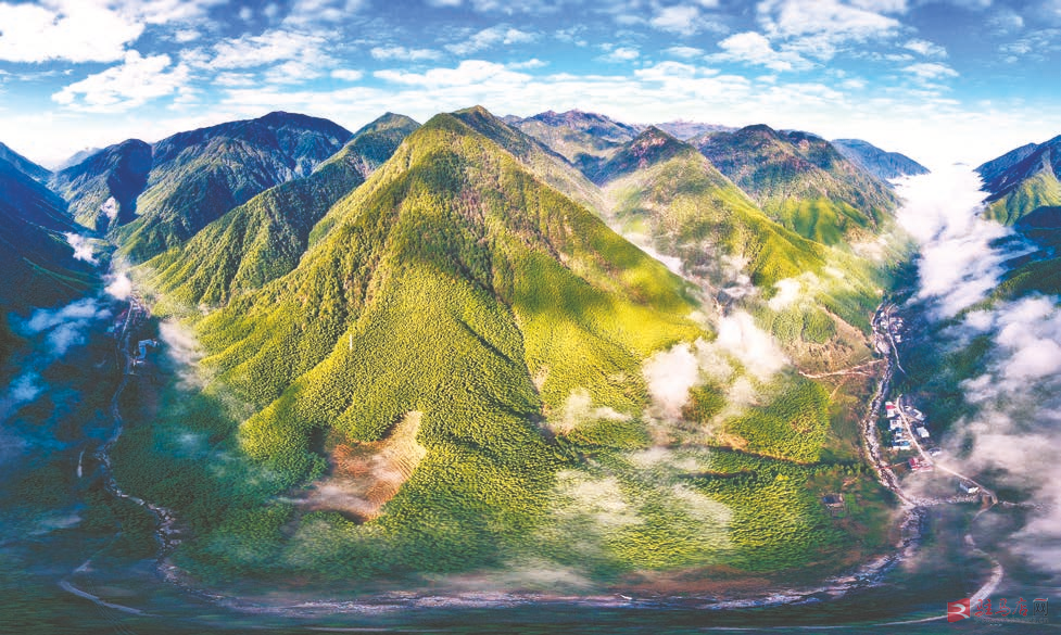 12月1日,武夷断裂带峡谷内云雾缭绕,村庄若隐若现(无人机照片)。