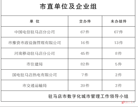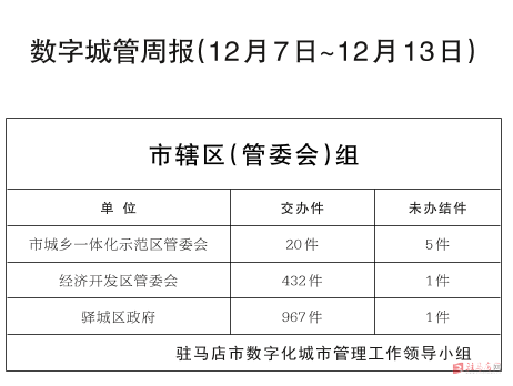 2020年12月7日~12月13日,驻马店市智慧城市管理中心通过采集员、网格员采集上报、视频抓拍、市民举报、领导交办等途径受理各类城市管理案件4186件,本周应结案4503件,其中已结案4108件、正在办理中146件、超时未办结104件、因确权争议未处置案件共145件,结案率91.23%,所有案件均通过数字城管系统派遣交办至18个联动单位,经采集员核查,截至12月13日18时,存在超时未办结案件的单位共9个,详细情况如下: