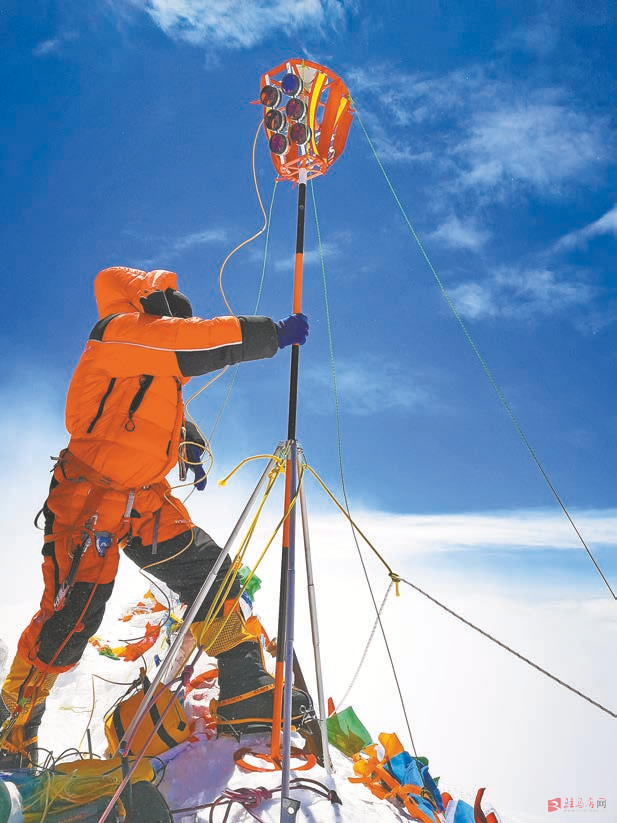 12月8日,中国和尼泊尔共同向世界宣布,珠穆朗玛峰的最新雪面高程为8848.86米。2020珠峰高程测量登山队队员在珠穆朗玛峰峰顶开展测量工作(5月27日摄)。
