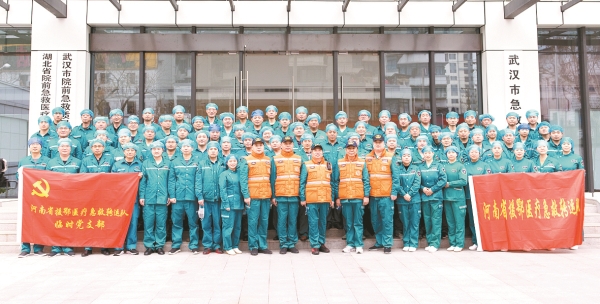2020年2月4日,在接到国家卫健委紧急通知不到8个小时,来自河南郑州、平顶山、漯河的援鄂医疗急救转运队的81名急救勇士、21辆急救车紧急集结完毕,他们是全国唯一挺进武汉的院前急救转运队。援鄂行进途中,队长乔伍营全面摸底队员情况,在急救车上成立了一支车轮上的临时党支部。在武汉,党员始终奋战在最前沿,他们与死神赛跑,每天防护服湿干几番,甚至要穿上纸尿裤,有时来不及吃上一顿热饭,经常是凌晨三时多才返回驻地。一个多月时间,在河南援鄂医疗急救转运队临时党支部的带领下,81名急救勇士把抗疫阻击战的责任和使命牢牢扛在肩上,成功转运2525名新冠肺炎患者。他们被国家卫生健康委、人力资源和社会保障部、国家中医药管理局授予“全国卫生健康系统新冠肺炎疫情防控工作先进集体”。