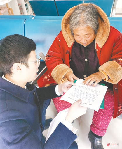 近日,一名拄着双拐的老人到确山农商银行任店支行营业大厅办理业务。看到老人行动不便,正在值班的该支行副行长时明连忙走上前询问情况。当得知老人是专门来办理高龄补贴银行卡时,时明立即拿来办卡单据蹲到老人面前,帮她填写相关资料信息。