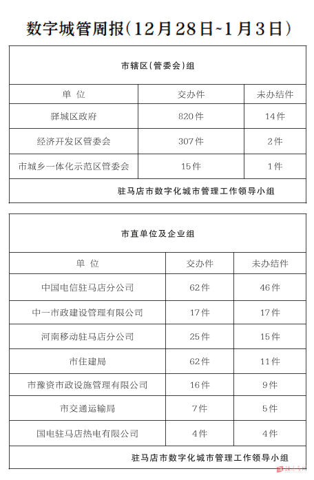 2020年12月28日~2021年1月3日,驻马店市智慧城市管理中心通过采集员、网格员采集上报、视频抓拍、领导交办等途径受理各类城市管理案件4032件,本周应结案3616件,其中已结案3241件、正在办理中121件、超时未办结124件、因确权争议未处置案件共130件,结案率89.63%,所有案件均通过数字城管系统派遣交办至18个联动单位,经采集员核查,截至1月3日18时,存在超时未办结案件的单位共10个,详细情况如下: